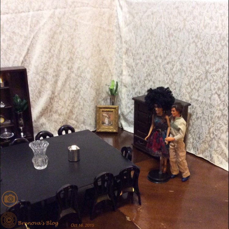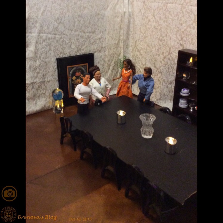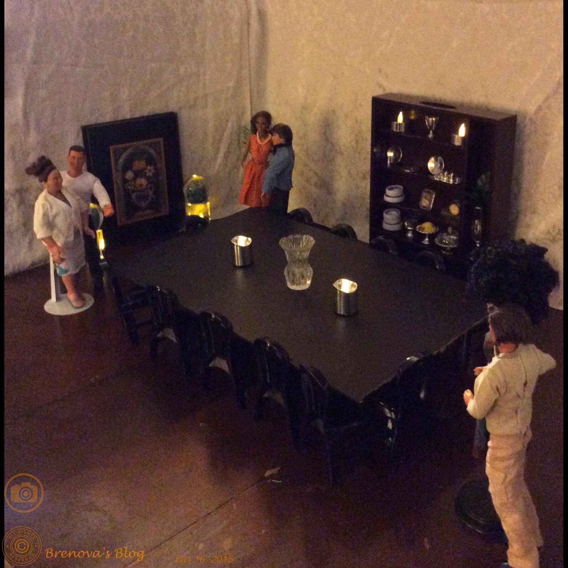 1. Hi again Vicki. I sent you a bunch of info a few days ago about the chairs. I got them from Walmart from their dollhouse collection. They came 2 in a package with a table and 2 stools and a bistro table. The set is $5. I bought 6 sets over time because I needed 12 chairs. They were purple and I sprayed them black. I made the table by using three of the tables from the walmart sets placed side by side then topped with a piece of black wood like material. All of the candles came from the Dollar Tree Store. The globe fish aquariums came from the Dollar store many many years ago. I may have more but it was a long time ago. I’ll check. Thanks so much for following my blog; I really appreciate that. Blessings.