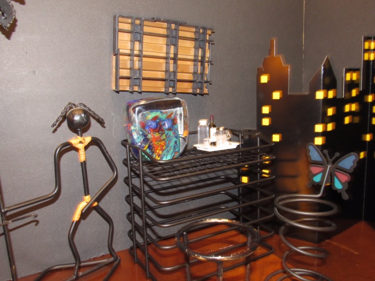 Standing guard over the English abode is their trusty Iron Soldier. The couple acquired him on one of their several trips abroad. To compliment him, the couple bought an iron bar set to go with him. They especially like the abstract wood and iron wall hanging above the bar.