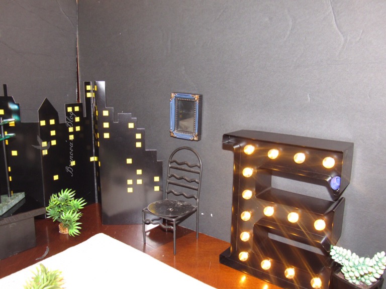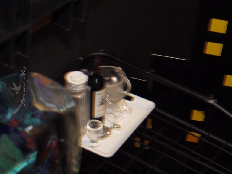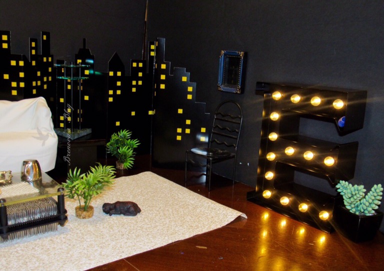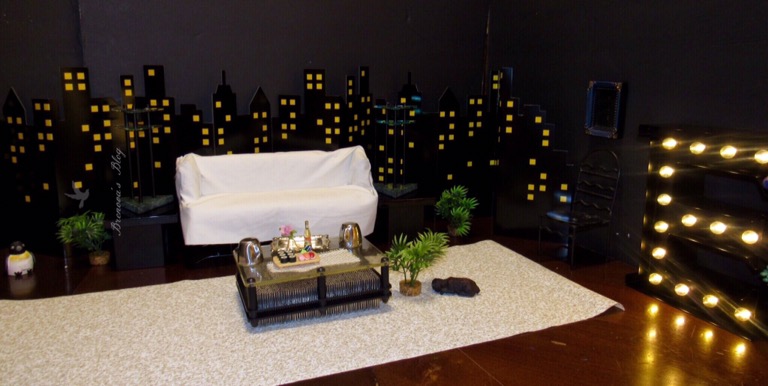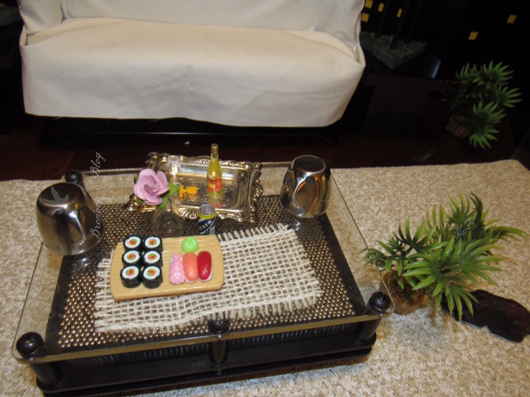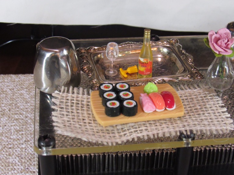 Sushi and A bottle of Sauvignon Blanc are served for Mom and Dad. The nailbed, glass top table was an exciting find for Enid. Eldridge fell in love with its unique flare.