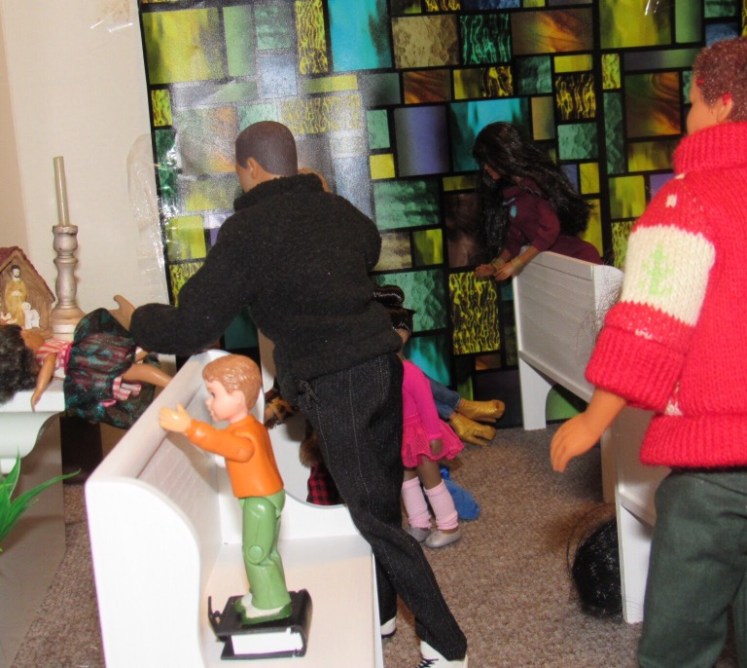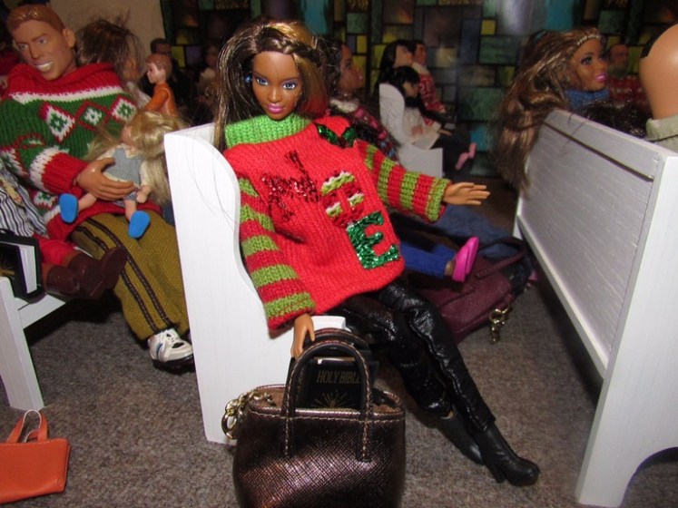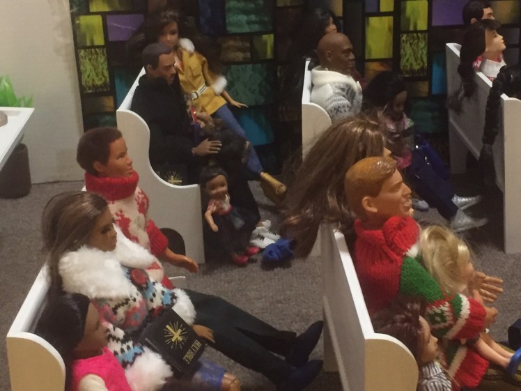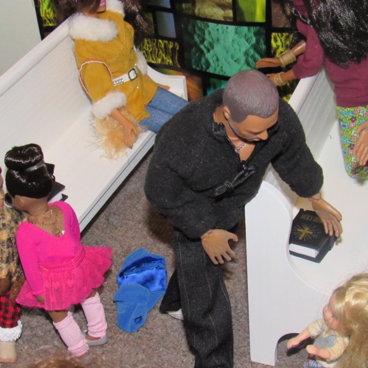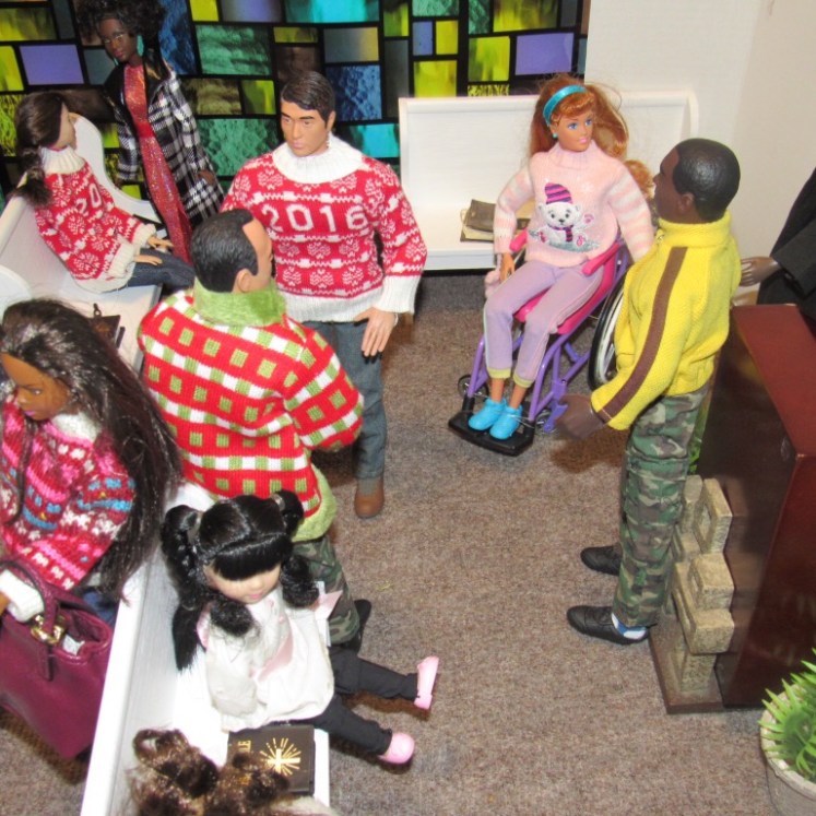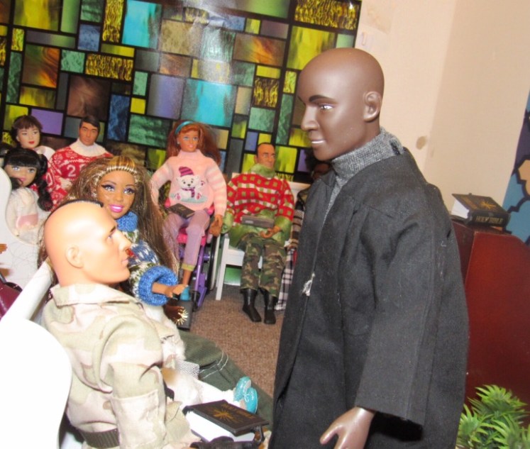 Chaplain Justice James is the pastor of Fort Obama Community Church. He’s wrapping up his message as the members attentively listens. Chaplain “J”, as he is affectionately called, is the husband of Journey, whom we met on her cross country adventure. He is also the brother of Thomas James, who was featured in the photo video “Addictive Love.” Stay tuned to meet the rest of the families at Fort Obama Community Church, located here in Brenova Town.Look who’s back… Lucy Sereta Downs! Yes, the little lady who defines TROUBLE is back. Get to finally meet her parents and her older sister. Even now, you’ll notice, Mr. Downs is holding on to her ponytail because she’s about to do her thing.Chaplain J finishes his message and closes his bible. Before long, he notices Lucy Sereta Downs up to her usual antics. Amused, he moves forward to address the congregation and to offer the benediction. Before he ends, he goes to SGT Jenson Rojo to offer words of comfort. SGT Jenson Rojo his wife Chloé and daughter Fabiana.Kyle & Rema Chan missed going to their favorite holiday spot-The Red Barn Christmas Place. They love to take their daughter, Pia, to see the lights and to sit in her favorite red sleigh. Kyle is stationed at Fort Obama and works as an engineer. Rema is in the process of opening a florist shop, “Pretty Flower” with the help of her twin sister Tonda Tomocken. (You met Tonda and her husband Bash during their summer trip to Hilton Head) Unfortunately this afternoon, Pia has started feeling a bit under the weather but doesn’t want her dad to know. Her mom thinks she may have a slightly elevated temp. Pia knows that when her dad sees his baby girl not feeling well, he’ll be ready to get her home to a warm bed; she doesn’t want that!Corporal Ethan and Marriana Pulley with daughters Cheela and NavaehNewly engaged couple Tony Gwen and Angel Peoples. Becky and Master SGT. Robin Williamsby. Service is wrapping up but SGT Jenson Rojo has drifted away in thought. Concerned about his final surgery to repair his damaged hands, Jenson is more concerned about his wife Chloé and daughter Fabiana far more than himself. After all, he doesn’t want them to be burdened by his being incapacitated at Christmastime. Chloé has assured him that he could never be a burden on his family. SGT Rojo’s hands were injured while he was on a tour of duty in Afghanistan. He has undergone many surgeries-this being the last. Tomorrow, his gloves will be removed to reveal his new hands. The Rojo family is eternally grateful to an anonymous donor who paid for all of the surgeries and the care of the family, while SGT Rojo recovered. They are also eternally grateful to the Wounded Warriors Project family during their time of need. Stay tuned to DivaDolls Dioramas By Brenova for updates and to meet the rest of the families at Fort Obama Community Church, located here in Brenova Town. Knowing what Jenson is going through, Chaplain J is moved with compassion when he notices the blank stare on his brother’s face. He approaches Jenson and offers him words of comfort. He also reminds him that every adult in the sanctuary has and will continue to be of service to him and his family. “That’s how we roll here Bro’.” Chaplain J reminds him. Feeling relief, Jenson thanks his pastor/friend. Chloé lovingly takes it all in. Stay tuned to DivaDolls Dioramas By Brenova to get updates and to meet the rest of the families at Fort Obama Community Church.The Rojo family thanking the congregation for their love, support and prayers.#brenovatown #diorama #onesixthscale #actionfigures #afganistan #loridolls #reconstructivesurgery #militaryfamilies #houseofworship #obama #beckybarbie #wheelchair #disability #bestfriend #bff you #militarychaplain #militarylife #militaryworship #multicultural #ohholynight #christmas #justdollfurniture