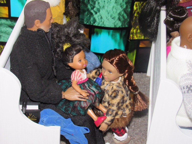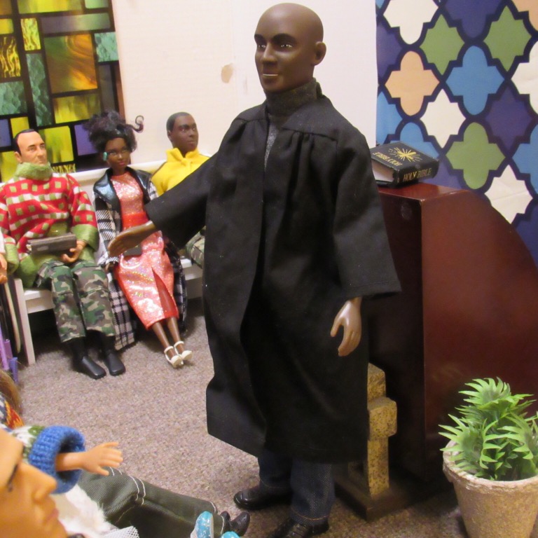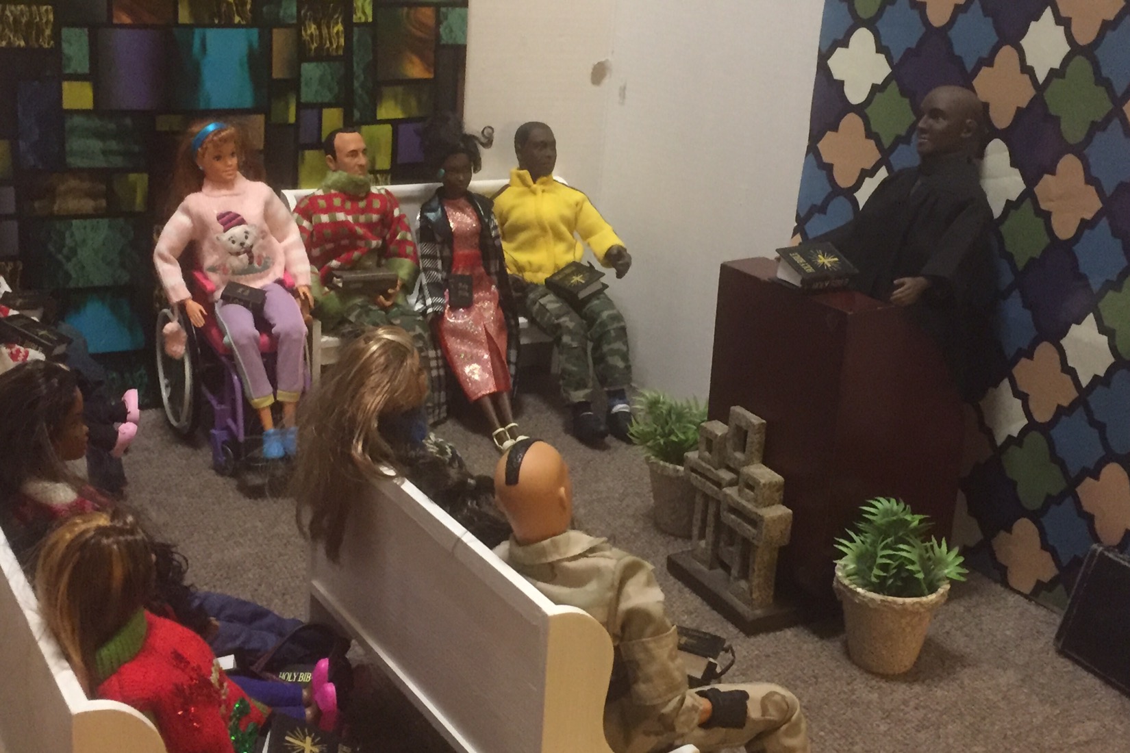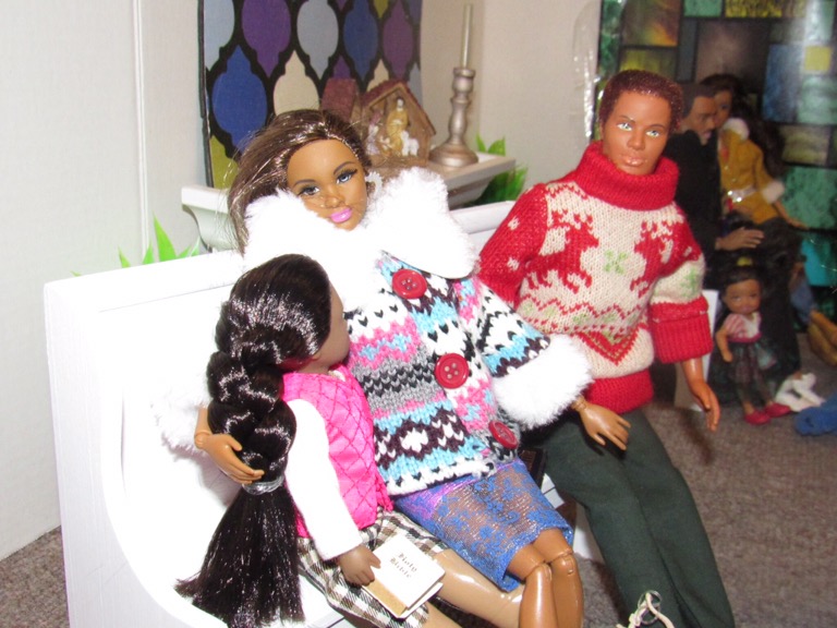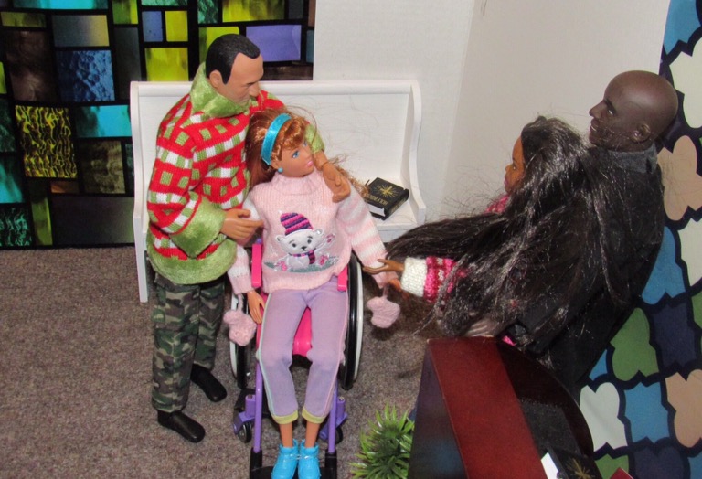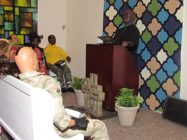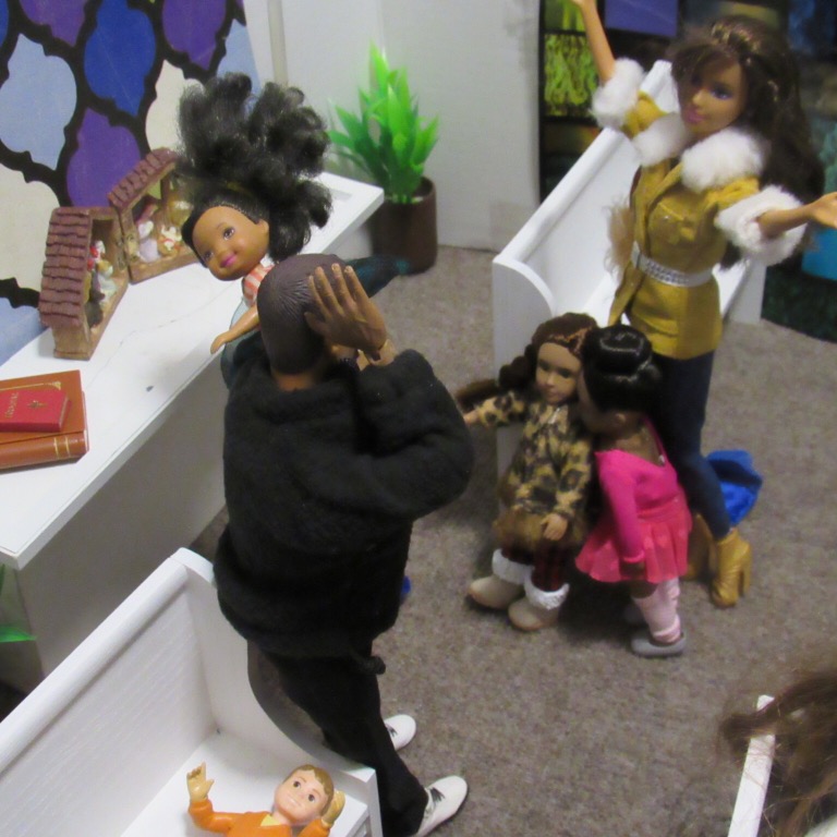 Chaplain Justice James is the pastor of Fort Obama Community Church. He’s wrapping up his message as the members attentively listens. Chaplain “J”, as he is affectionately called, is the husband of Journey, whom we met on her cross country adventure. He is also the brother of Thomas James, who was featured in the photo video “Addictive Love.” Stay tuned to meet the rest of the families at Fort Obama Community Church, located here in Brenova Town.Look who’s back… Lucy Sereta Downs! Yes, the little lady who defines TROUBLE is back. Get to finally meet her parents and her older sister. Even now, you’ll notice, Mr. Downs is holding on to her ponytail because she’s about to do her thing.Chaplain J finishes his message and closes his bible. Before long, he notices Lucy Sereta Downs up to her usual antics. Amused, he moves forward to address the congregation and to offer the benediction. Before he ends, he goes to SGT Jenson Rojo to offer words of comfort. SGT Jenson Rojo his wife Chloé and daughter Fabiana.Kyle & Rema Chan missed going to their favorite holiday spot-The Red Barn Christmas Place. They love to take their daughter, Pia, to see the lights and to sit in her favorite red sleigh. Kyle is stationed at Fort Obama and works as an engineer. Rema is in the process of opening a florist shop, “Pretty Flower” with the help of her twin sister Tonda Tomocken. (You met Tonda and her husband Bash during their summer trip to Hilton Head) Unfortunately this afternoon, Pia has started feeling a bit under the weather but doesn’t want her dad to know. Her mom thinks she may have a slightly elevated temp. Pia knows that when her dad sees his baby girl not feeling well, he’ll be ready to get her home to a warm bed; she doesn’t want that!Corporal Ethan and Marriana Pulley with daughters Cheela and NavaehNewly engaged couple Tony Gwen and Angel Peoples. Becky and Master SGT. Robin Williamsby. Service is wrapping up but SGT Jenson Rojo has drifted away in thought. Concerned about his final surgery to repair his damaged hands, Jenson is more concerned about his wife Chloé and daughter Fabiana far more than himself. After all, he doesn’t want them to be burdened by his being incapacitated at Christmastime. Chloé has assured him that he could never be a burden on his family. SGT Rojo’s hands were injured while he was on a tour of duty in Afghanistan. He has undergone many surgeries-this being the last. Tomorrow, his gloves will be removed to reveal his new hands. The Rojo family is eternally grateful to an anonymous donor who paid for all of the surgeries and the care of the family, while SGT Rojo recovered. They are also eternally grateful to the Wounded Warriors Project family during their time of need. Stay tuned to DivaDolls Dioramas By Brenova for updates and to meet the rest of the families at Fort Obama Community Church, located here in Brenova Town. Knowing what Jenson is going through, Chaplain J is moved with compassion when he notices the blank stare on his brother’s face. He approaches Jenson and offers him words of comfort. He also reminds him that every adult in the sanctuary has and will continue to be of service to him and his family. “That’s how we roll here Bro’.” Chaplain J reminds him. Feeling relief, Jenson thanks his pastor/friend. Chloé lovingly takes it all in. Stay tuned to DivaDolls Dioramas By Brenova to get updates and to meet the rest of the families at Fort Obama Community Church.The Rojo family thanking the congregation for their love, support and prayers.#brenovatown #diorama #onesixthscale #actionfigures #afganistan #loridolls #reconstructivesurgery #militaryfamilies #houseofworship #obama #beckybarbie #wheelchair #disability #bestfriend #bff you #militarychaplain #militarylife #militaryworship #multicultural #ohholynight #christmas #justdollfurniture