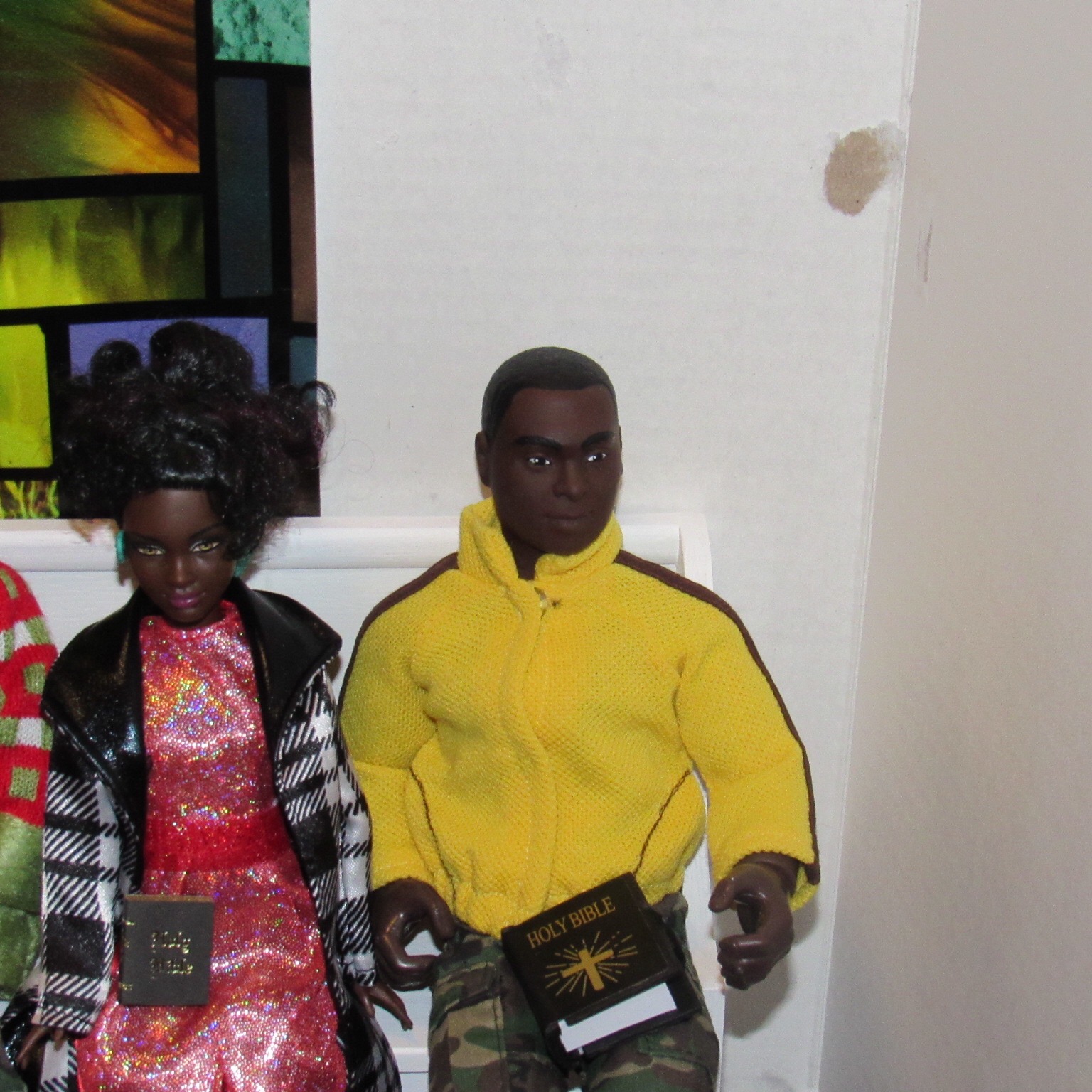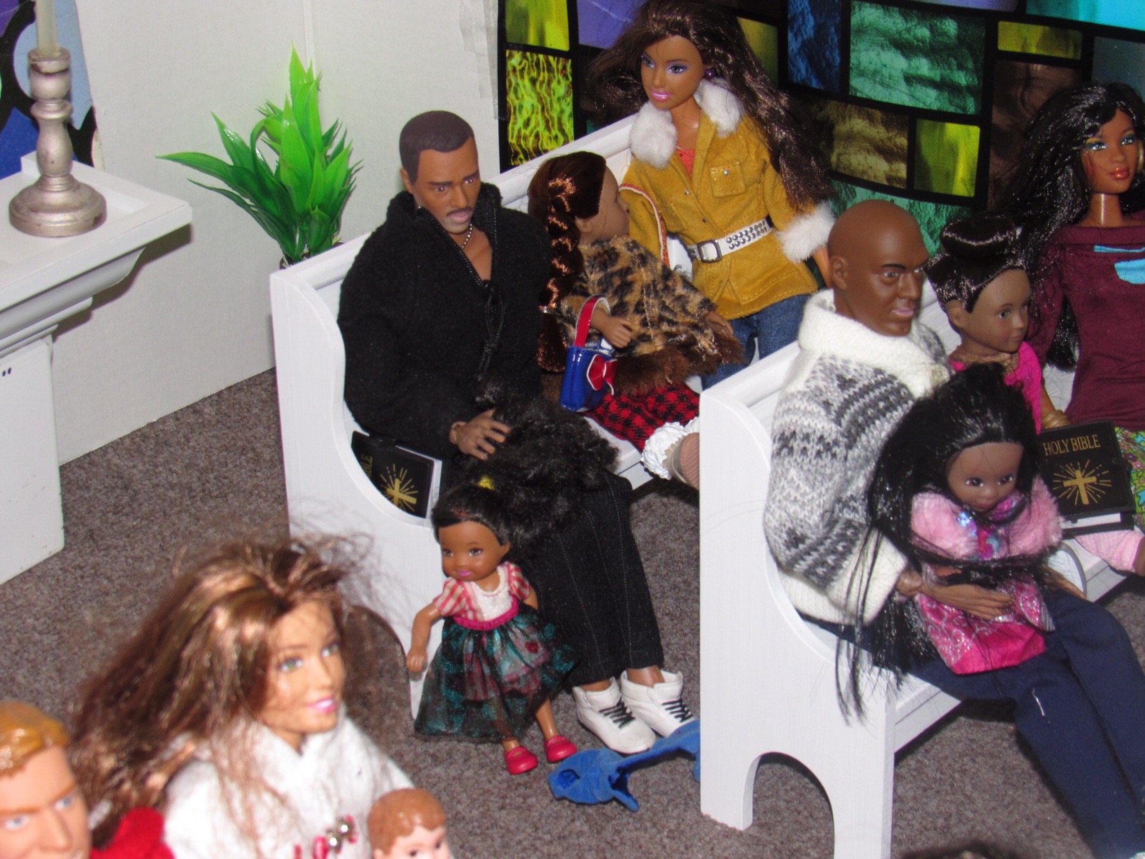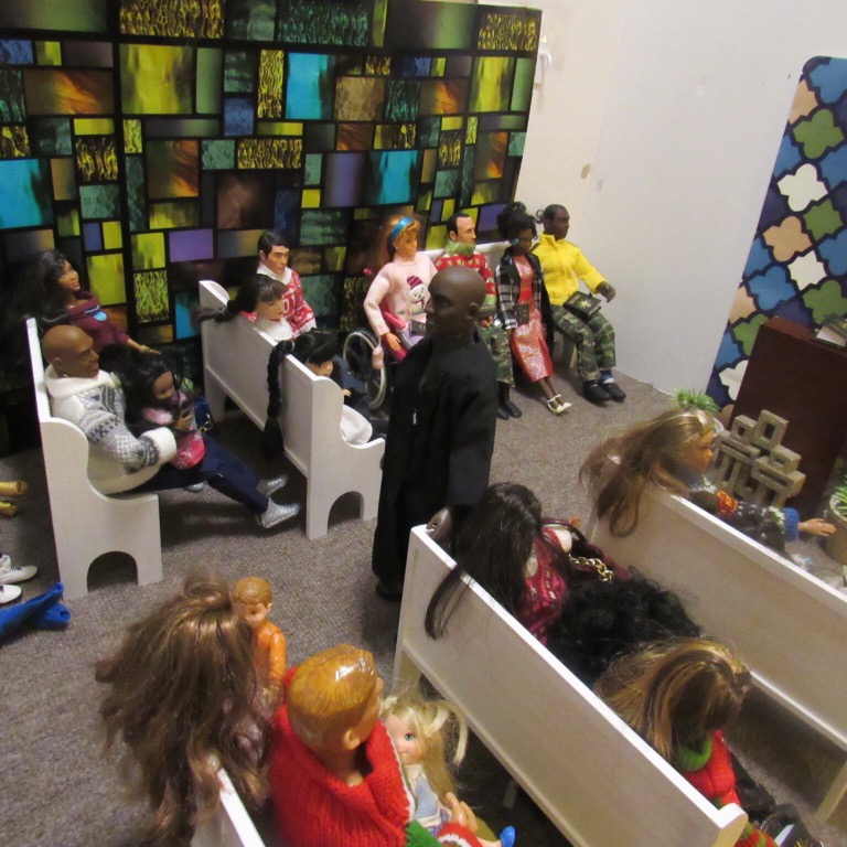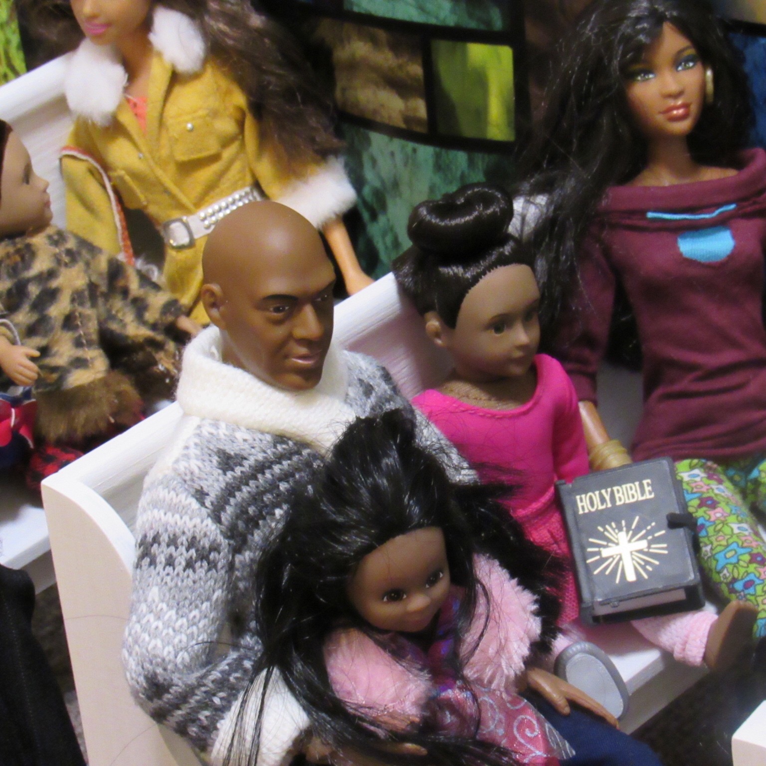 Chaplain Justice James is the pastor of Fort Obama Community Church. He’s wrapping up his message as the members attentively listens. Chaplain “J”, as he is affectionately called, is the husband of Journey, whom we met on her cross country adventure. He is also the brother of Thomas James, who was featured in the photo video “Addictive Love.” Stay tuned to meet the rest of the families at Fort Obama Community Church, located here in Brenova Town.Look who’s back… Lucy Sereta Downs! Yes, the little lady who defines TROUBLE is back. Get to finally meet her parents and her older sister. Even now, you’ll notice, Mr. Downs is holding on to her ponytail because she’s about to do her thing.Chaplain J finishes his message and closes his bible. Before long, he notices Lucy Sereta Downs up to her usual antics. Amused, he moves forward to address the congregation and to offer the benediction. Before he ends, he goes to SGT Jenson Rojo to offer words of comfort. SGT Jenson Rojo his wife Chloé and daughter Fabiana.Kyle & Rema Chan missed going to their favorite holiday spot-The Red Barn Christmas Place. They love to take their daughter, Pia, to see the lights and to sit in her favorite red sleigh. Kyle is stationed at Fort Obama and works as an engineer. Rema is in the process of opening a florist shop, “Pretty Flower” with the help of her twin sister Tonda Tomocken. (You met Tonda and her husband Bash during their summer trip to Hilton Head) Unfortunately this afternoon, Pia has started feeling a bit under the weather but doesn’t want her dad to know. Her mom thinks she may have a slightly elevated temp. Pia knows that when her dad sees his baby girl not feeling well, he’ll be ready to get her home to a warm bed; she doesn’t want that!Corporal Ethan and Marriana Pulley with daughters Cheela and NavaehNewly engaged couple Tony Gwen and Angel Peoples. Becky and Master SGT. Robin Williamsby. Service is wrapping up but SGT Jenson Rojo has drifted away in thought. Concerned about his final surgery to repair his damaged hands, Jenson is more concerned about his wife Chloé and daughter Fabiana far more than himself. After all, he doesn’t want them to be burdened by his being incapacitated at Christmastime. Chloé has assured him that he could never be a burden on his family. SGT Rojo’s hands were injured while he was on a tour of duty in Afghanistan. He has undergone many surgeries-this being the last. Tomorrow, his gloves will be removed to reveal his new hands. The Rojo family is eternally grateful to an anonymous donor who paid for all of the surgeries and the care of the family, while SGT Rojo recovered. They are also eternally grateful to the Wounded Warriors Project family during their time of need. Stay tuned to DivaDolls Dioramas By Brenova for updates and to meet the rest of the families at Fort Obama Community Church, located here in Brenova Town. Knowing what Jenson is going through, Chaplain J is moved with compassion when he notices the blank stare on his brother’s face. He approaches Jenson and offers him words of comfort. He also reminds him that every adult in the sanctuary has and will continue to be of service to him and his family. “That’s how we roll here Bro’.” Chaplain J reminds him. Feeling relief, Jenson thanks his pastor/friend. Chloé lovingly takes it all in. Stay tuned to DivaDolls Dioramas By Brenova to get updates and to meet the rest of the families at Fort Obama Community Church.The Rojo family thanking the congregation for their love, support and prayers.#brenovatown #diorama #onesixthscale #actionfigures #afganistan #loridolls #reconstructivesurgery #militaryfamilies #houseofworship #obama #beckybarbie #wheelchair #disability #bestfriend #bff you #militarychaplain #militarylife #militaryworship #multicultural #ohholynight #christmas #justdollfurniture