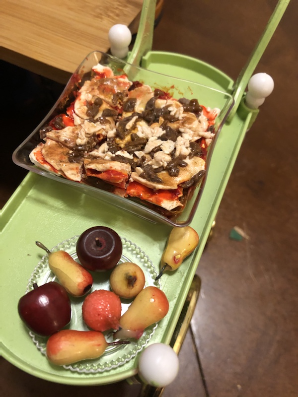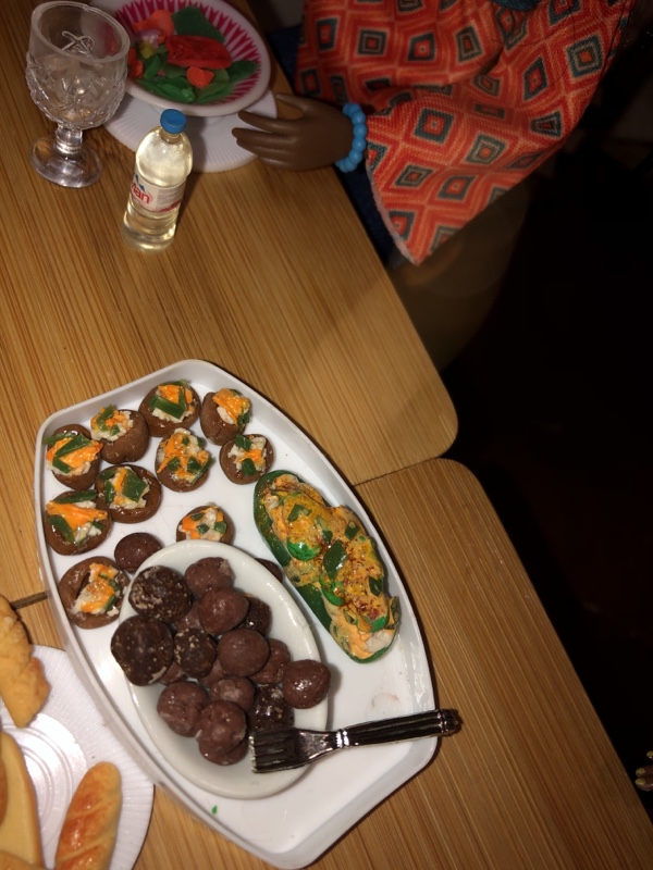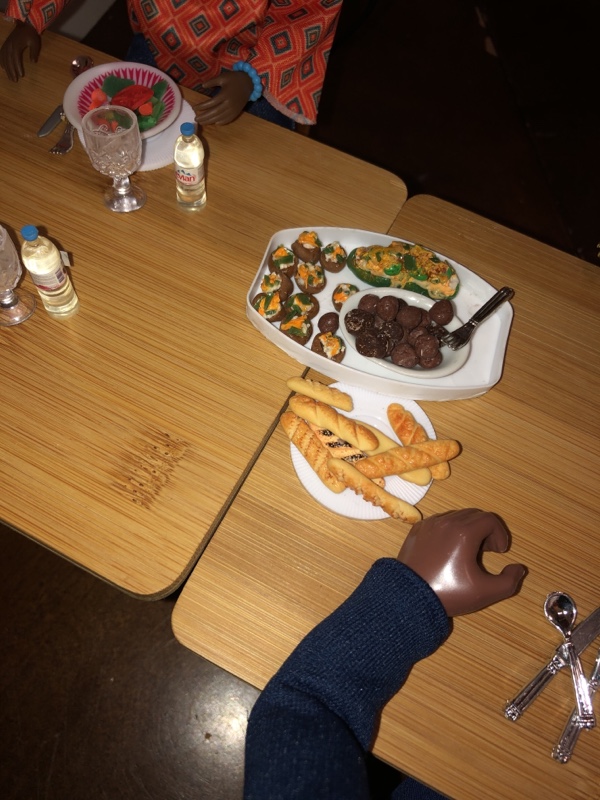 Mbali, their server returns to the table with a cart containing glasses with ice, bottled waters, breadsticks, stuffed mushroom caps, meatballs and individual salads. There is also an assortment of fruits.