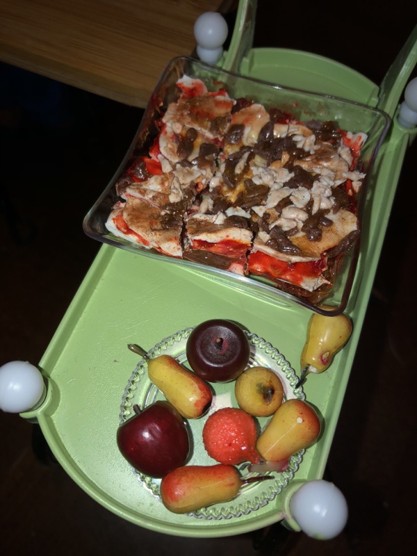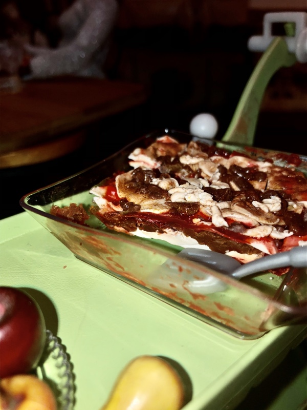 The main entree looked and smelled great. The aroma of the family sized lasagna was magnificent! The casserole dish was filled with bubbling cheese. Along with the lasagna, there were bowls of broccoli, cauliflower and carrots. Also, the couples each got a bottle of red wine. They all dug in and thoroughly enjoy their delicious meal.